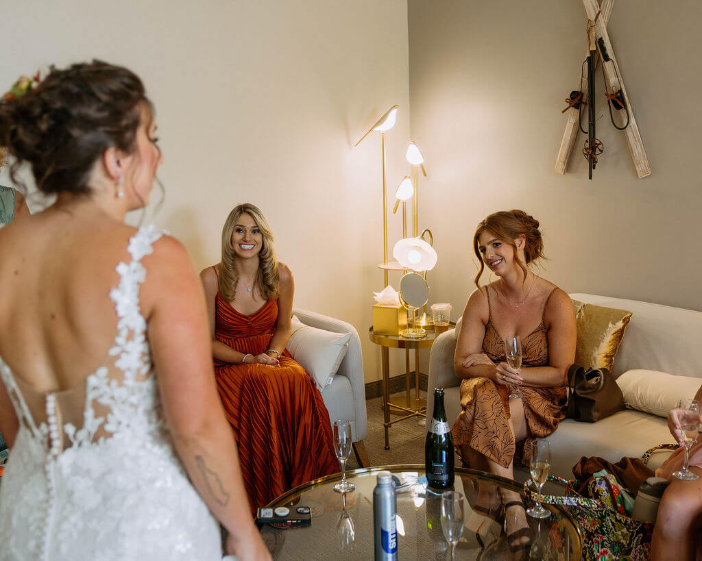 Their day starts in Solitude Village. Gina is getting ready and drinking champagne with her sisters and closest friends. Her parents step in to help her put on her wedding dress before heading up the chairlift.